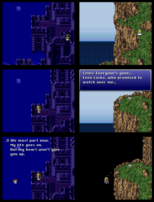 In opera, the phrase Aria di Mezzo Carattere is the name for a piece that is mid-way between seriousness and comedy. While this could be a metaphor for Final Fantasy VI as a whole, I believe the literal translation of the phrase, "Aria of Half Character," is a direct reference to Celes. Before this point, Celes is a blank slate, "pure as snow." "Maria and Draco" leaves a lasting impression on Celes and allows her to become a whole character long after the curtain closes.