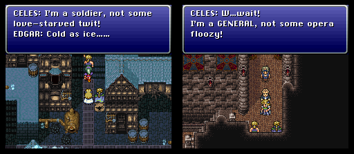 The second detail that interests me about Celes's introduction is the music that accompanies it. Every character, save Celes and the primary protagonist, Terra, have their theme songs playing when they are introduced. Thematically, the song that plays over Terra's introduction, “Awakening,” which features a leitmotif of her theme, makes sense because at the time, she is suffering from amnesia. It suggests her identity is bubbling up from below the surface, breaching momentarily, but obscured. For Celes, the song that introduces her is “Under Martial Law.” This same song also plays in any Empire-occupied town in the game, and suggests that Celes, as a person, is currently “occupied” by the empire. Celes still identifies as a general when the player meets her, despite having lost the title officially. Her true theme isn't heard until much later.