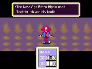 | "Earthbound's" New-Age Retro Hippie wants to fight. (Note the similarity to Dragon Quest's battles) |
